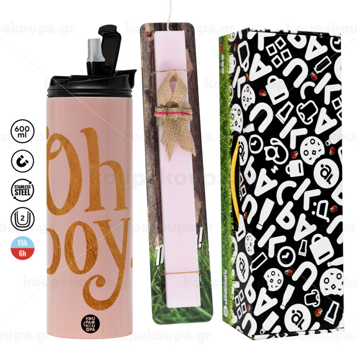 Oh baby gold, Πασχαλινή Λαμπάδα με ΡΟΖ Travel Tumbler θερμό (600ml, BPA free) & κερί αρωματικό πλακέ (30cm) (ΡΟΖ)