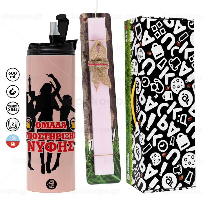 Bachelor Ομάδα υποστήριξης Νύφης, Πασχαλινή Λαμπάδα με ΡΟΖ Travel Tumbler θερμό (600ml, BPA free) & κερί αρωματικό πλακέ (30cm) (ΡΟΖ)
