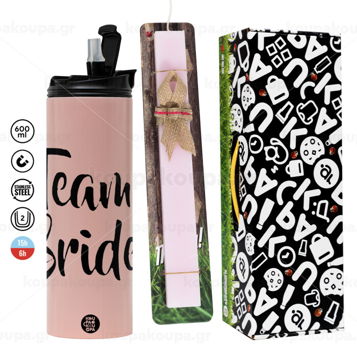 Team Bride, Πασχαλινή Λαμπάδα με ΡΟΖ Travel Tumbler θερμό (600ml, BPA free) & κερί αρωματικό πλακέ (30cm) (ΡΟΖ)