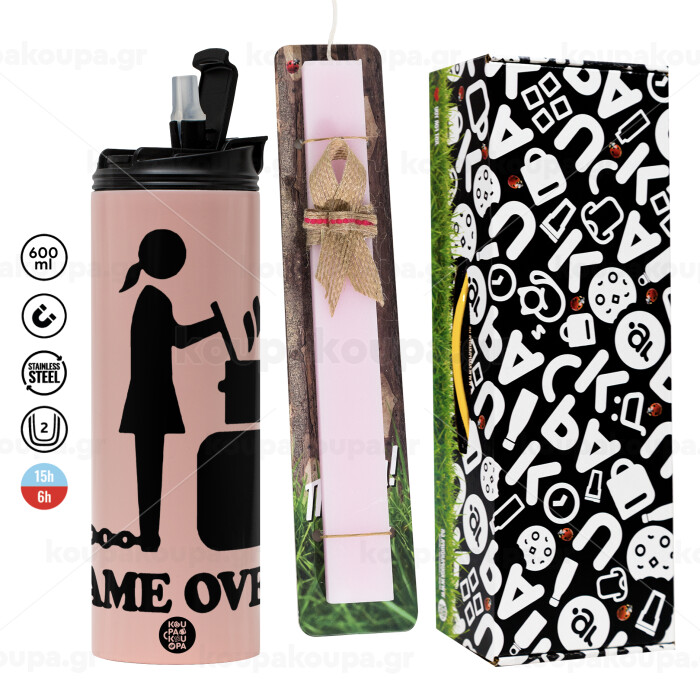 Woman Game Over, Πασχαλινή Λαμπάδα με ΡΟΖ Travel Tumbler θερμό (600ml, BPA free) & κερί αρωματικό πλακέ (30cm) (ΡΟΖ)