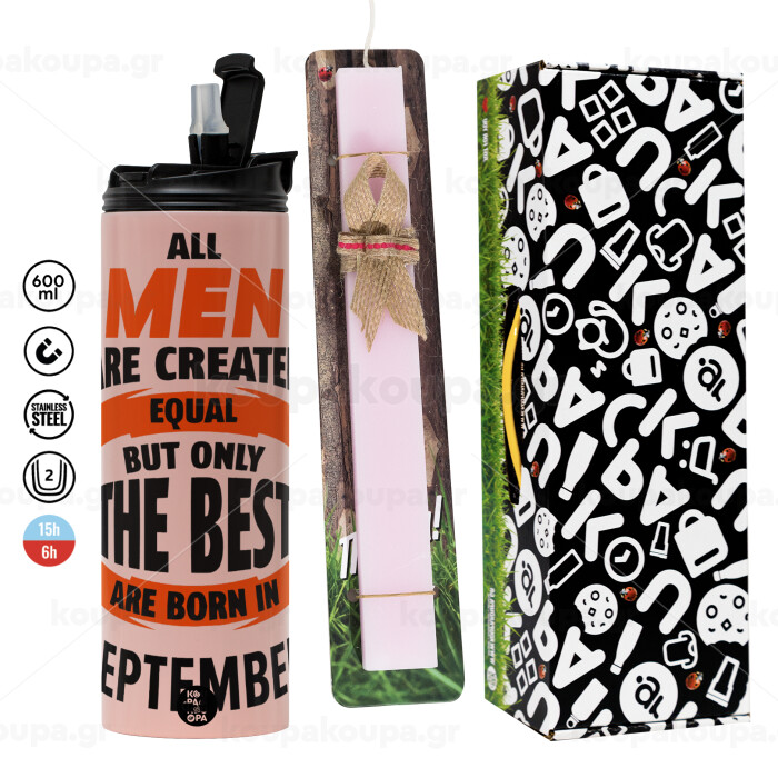 All men are created equal but only the best are born in September, Πασχαλινή Λαμπάδα με ΡΟΖ Travel Tumbler θερμό (600ml, BPA free) & κερί αρωματικό πλακέ (30cm) (ΡΟΖ)