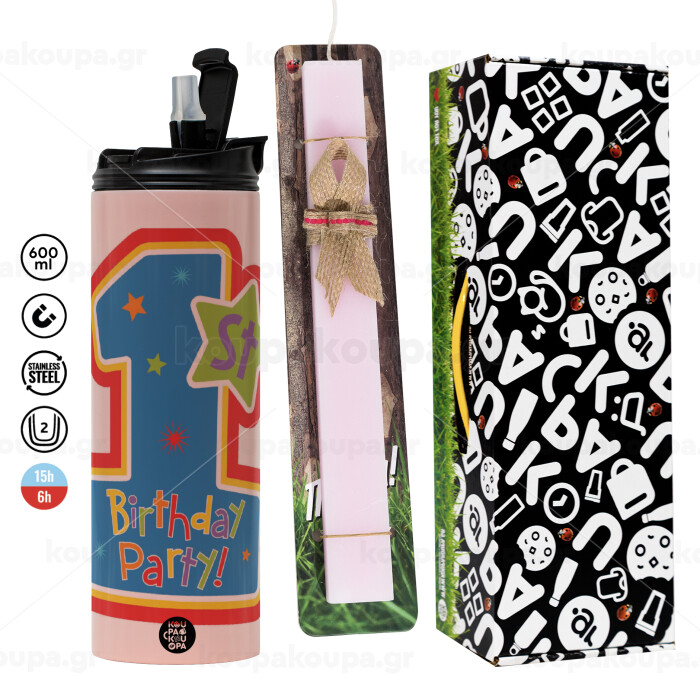 Happy 1st Birthday, Πασχαλινή Λαμπάδα με ΡΟΖ Travel Tumbler θερμό (600ml, BPA free) & κερί αρωματικό πλακέ (30cm) (ΡΟΖ)