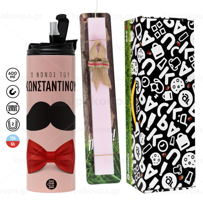 Ο νονός μου, μουστάκι με παπιγιόν, Πασχαλινή Λαμπάδα με ΡΟΖ Travel Tumbler θερμό (600ml, BPA free) & κερί αρωματικό πλακέ (30cm) (ΡΟΖ)