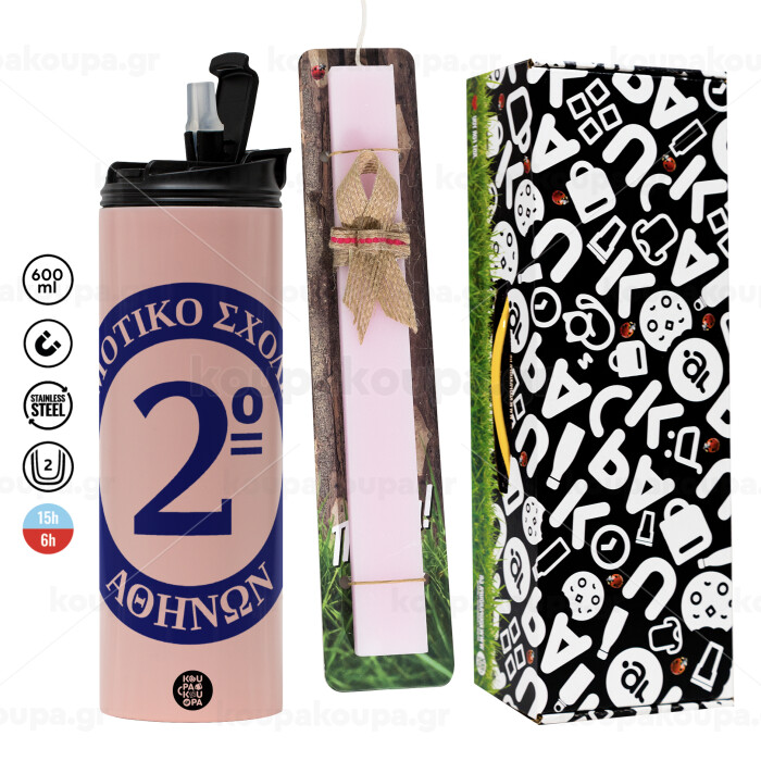 Έμβλημα Σχολικό μπλε, Πασχαλινή Λαμπάδα με ΡΟΖ Travel Tumbler θερμό (600ml, BPA free) & κερί αρωματικό πλακέ (30cm) (ΡΟΖ)