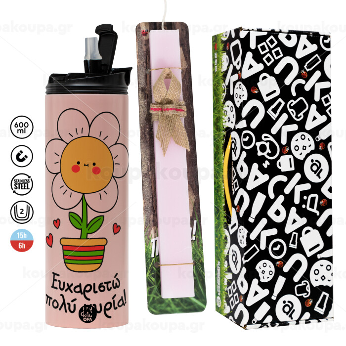 Ευχαριστώ πολύ κυρία!!!, Πασχαλινή Λαμπάδα με ΡΟΖ Travel Tumbler θερμό (600ml, BPA free) & κερί αρωματικό πλακέ (30cm) (ΡΟΖ)