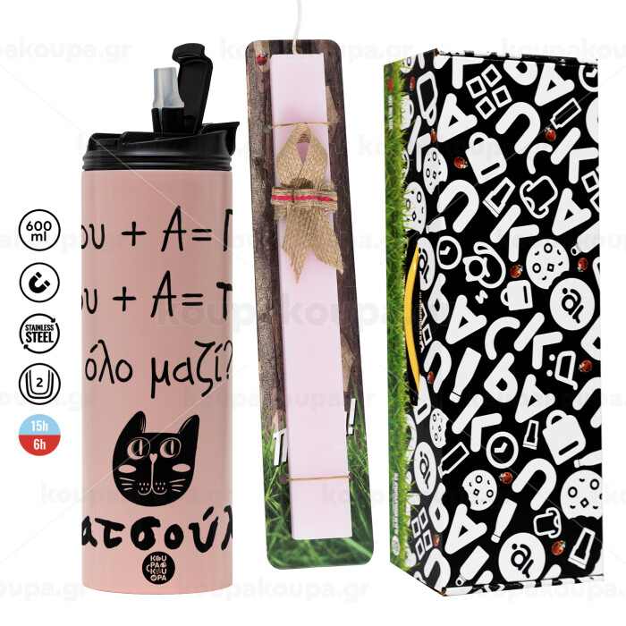 Κατσούλα, Πασχαλινή Λαμπάδα με ΡΟΖ Travel Tumbler θερμό (600ml, BPA free) & κερί αρωματικό πλακέ (30cm) (ΡΟΖ)