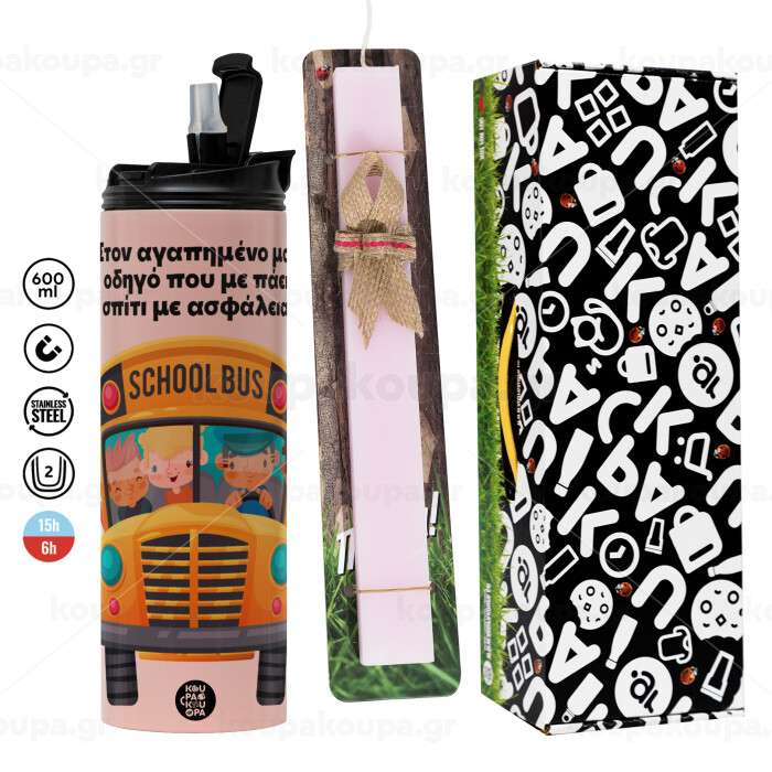 Στον αγαπημένο μου οδηγό που με πάει σπίτι με ασφάλεια!, Πασχαλινή Λαμπάδα με ΡΟΖ Travel Tumbler θερμό (600ml, BPA free) & κερί αρωματικό πλακέ (30cm) (ΡΟΖ)