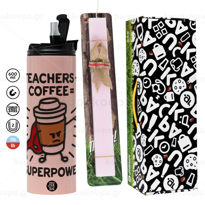 Teacher Coffee Super Power, Πασχαλινή Λαμπάδα με ΡΟΖ Travel Tumbler θερμό (600ml, BPA free) & κερί αρωματικό πλακέ (30cm) (ΡΟΖ)