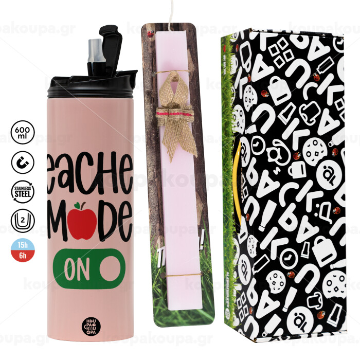Teacher mode ON, Πασχαλινή Λαμπάδα με ΡΟΖ Travel Tumbler θερμό (600ml, BPA free) & κερί αρωματικό πλακέ (30cm) (ΡΟΖ)