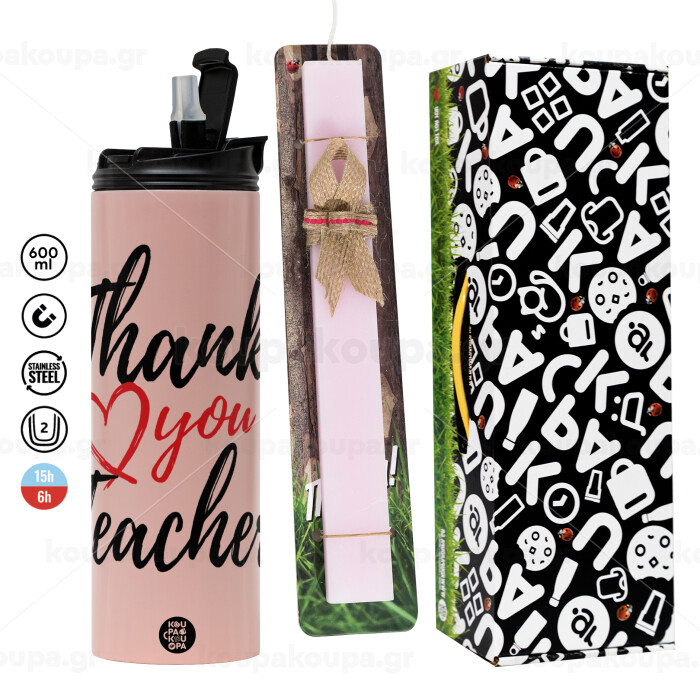 Thank you teacher, Πασχαλινή Λαμπάδα με ΡΟΖ Travel Tumbler θερμό (600ml, BPA free) & κερί αρωματικό πλακέ (30cm) (ΡΟΖ)