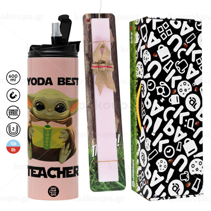 Yoda Best Teacher, Πασχαλινή Λαμπάδα με ΡΟΖ Travel Tumbler θερμό (600ml, BPA free) & κερί αρωματικό πλακέ (30cm) (ΡΟΖ)
