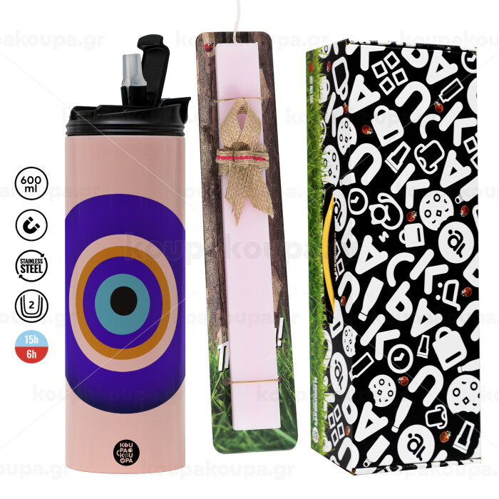 Το μάτι, Πασχαλινή Λαμπάδα με ΡΟΖ Travel Tumbler θερμό (600ml, BPA free) & κερί αρωματικό πλακέ (30cm) (ΡΟΖ)