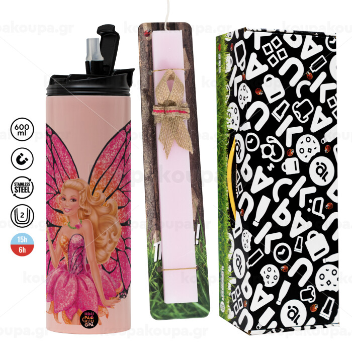 Barbie Νεράιδα, Πασχαλινή Λαμπάδα με ΡΟΖ Travel Tumbler θερμό (600ml, BPA free) & κερί αρωματικό πλακέ (30cm) (ΡΟΖ)