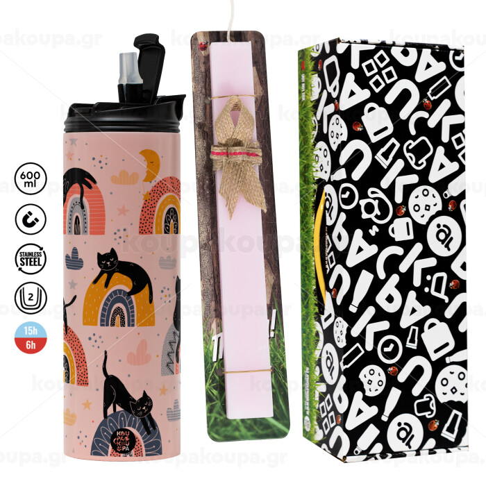 Γατούλες, Πασχαλινή Λαμπάδα με ΡΟΖ Travel Tumbler θερμό (600ml, BPA free) & κερί αρωματικό πλακέ (30cm) (ΡΟΖ)