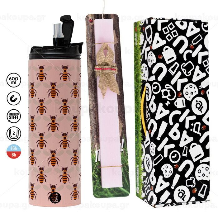 Μελισσούλες, Πασχαλινή Λαμπάδα με ΡΟΖ Travel Tumbler θερμό (600ml, BPA free) & κερί αρωματικό πλακέ (30cm) (ΡΟΖ)