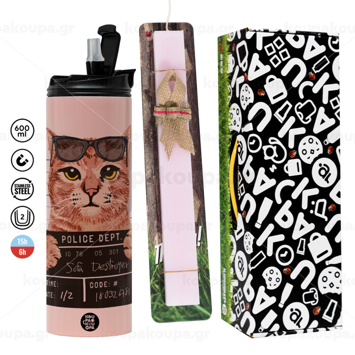 Cool cat, Πασχαλινή Λαμπάδα με ΡΟΖ Travel Tumbler θερμό (600ml, BPA free) & κερί αρωματικό πλακέ (30cm) (ΡΟΖ)