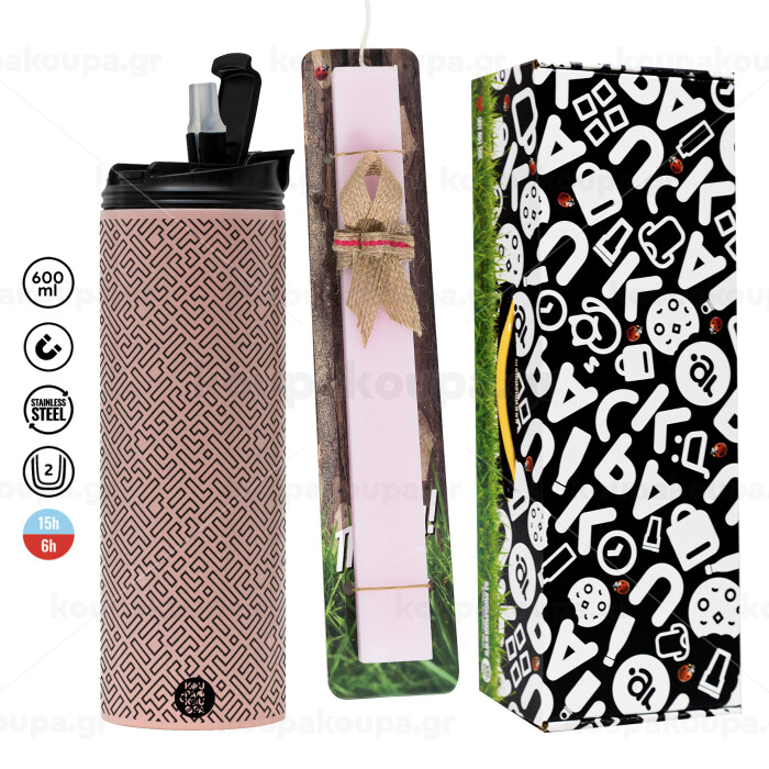 Doodle Maze, Πασχαλινή Λαμπάδα με ΡΟΖ Travel Tumbler θερμό (600ml, BPA free) & κερί αρωματικό πλακέ (30cm) (ΡΟΖ)