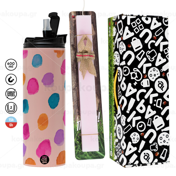 Watercolor dots, Πασχαλινή Λαμπάδα με ΡΟΖ Travel Tumbler θερμό (600ml, BPA free) & κερί αρωματικό πλακέ (30cm) (ΡΟΖ)
