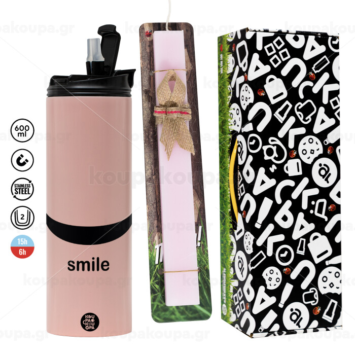 Smile!!!, Πασχαλινή Λαμπάδα με ΡΟΖ Travel Tumbler θερμό (600ml, BPA free) & κερί αρωματικό πλακέ (30cm) (ΡΟΖ)