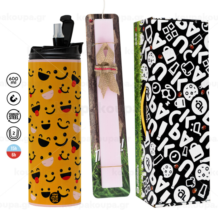 Smilies , Πασχαλινή Λαμπάδα με ΡΟΖ Travel Tumbler θερμό (600ml, BPA free) & κερί αρωματικό πλακέ (30cm) (ΡΟΖ)