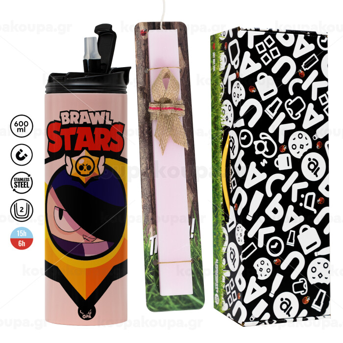Brawl Stars Edgar, Πασχαλινή Λαμπάδα με ΡΟΖ Travel Tumbler θερμό (600ml, BPA free) & κερί αρωματικό πλακέ (30cm) (ΡΟΖ)