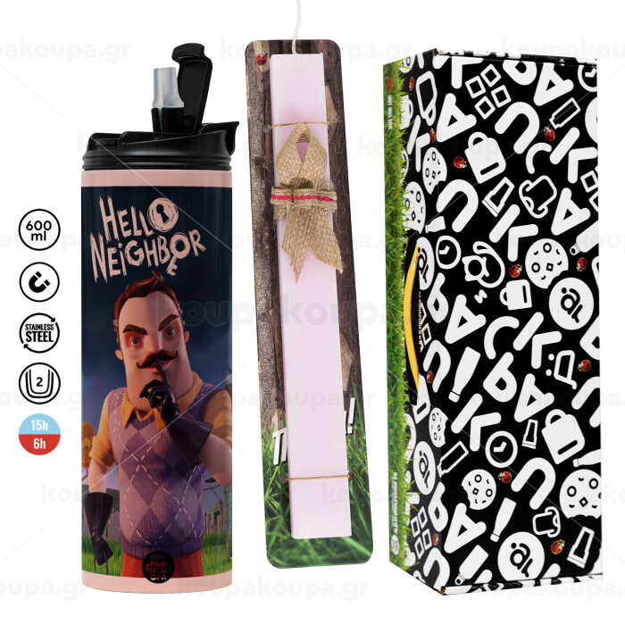 Hello Neighbor, Πασχαλινή Λαμπάδα με ΡΟΖ Travel Tumbler θερμό (600ml, BPA free) & κερί αρωματικό πλακέ (30cm) (ΡΟΖ)