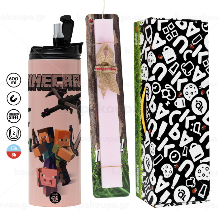 Minecraft Alex, Πασχαλινή Λαμπάδα με ΡΟΖ Travel Tumbler θερμό (600ml, BPA free) & κερί αρωματικό πλακέ (30cm) (ΡΟΖ)