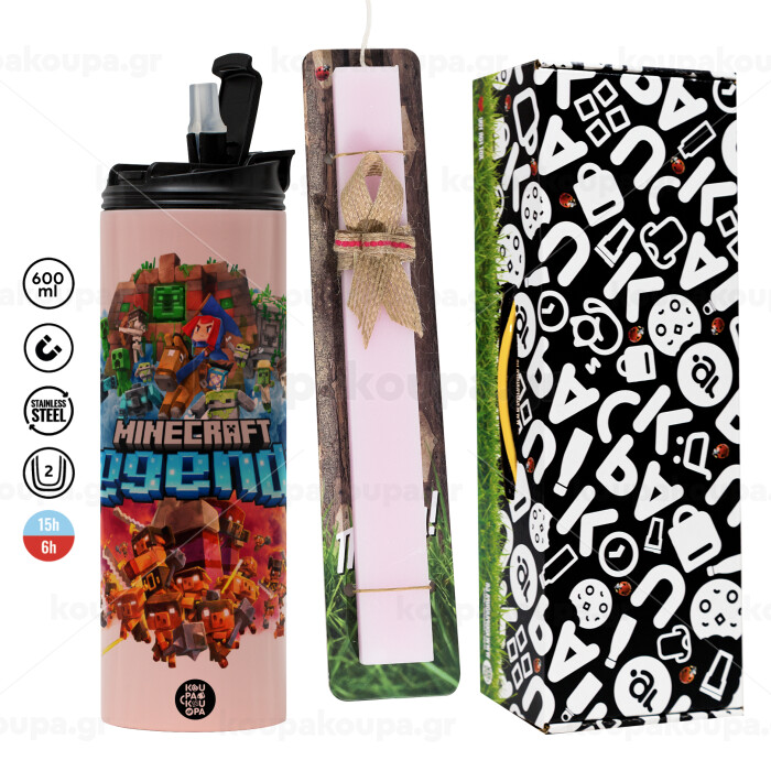 Minecraft legends, Πασχαλινή Λαμπάδα με ΡΟΖ Travel Tumbler θερμό (600ml, BPA free) & κερί αρωματικό πλακέ (30cm) (ΡΟΖ)