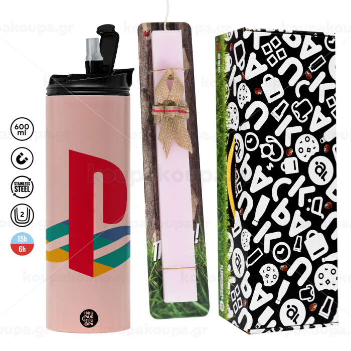 Playstation, Πασχαλινή Λαμπάδα με ΡΟΖ Travel Tumbler θερμό (600ml, BPA free) & κερί αρωματικό πλακέ (30cm) (ΡΟΖ)
