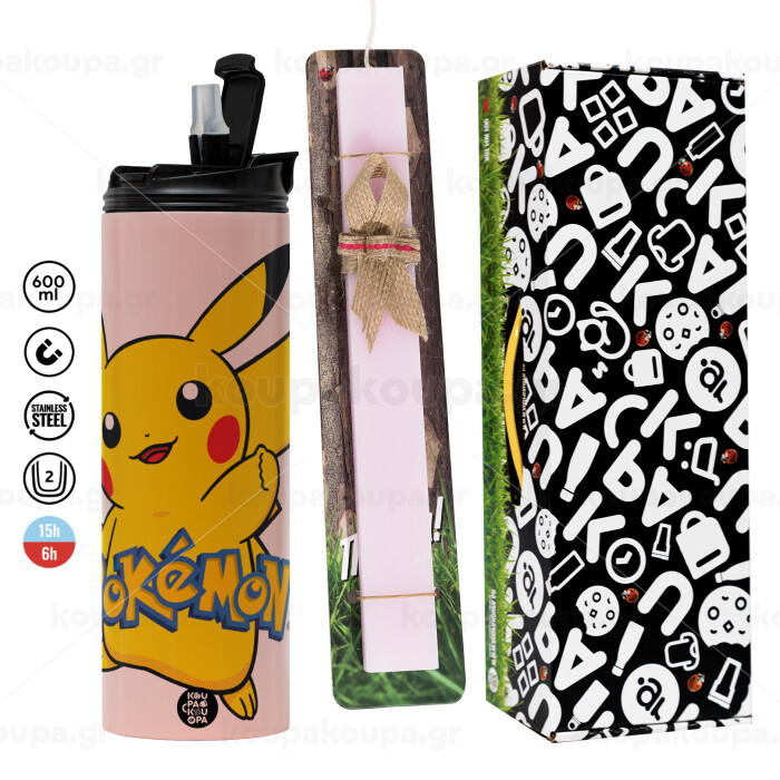 Pokemon pikachu, Πασχαλινή Λαμπάδα με ΡΟΖ Travel Tumbler θερμό (600ml, BPA free) & κερί αρωματικό πλακέ (30cm) (ΡΟΖ)