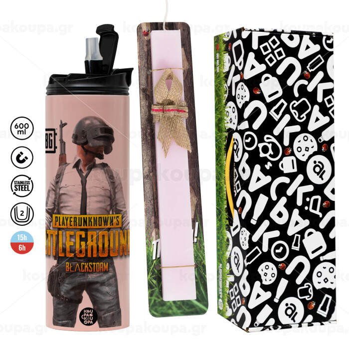 PUBG battleground royale, Πασχαλινή Λαμπάδα με ΡΟΖ Travel Tumbler θερμό (600ml, BPA free) & κερί αρωματικό πλακέ (30cm) (ΡΟΖ)