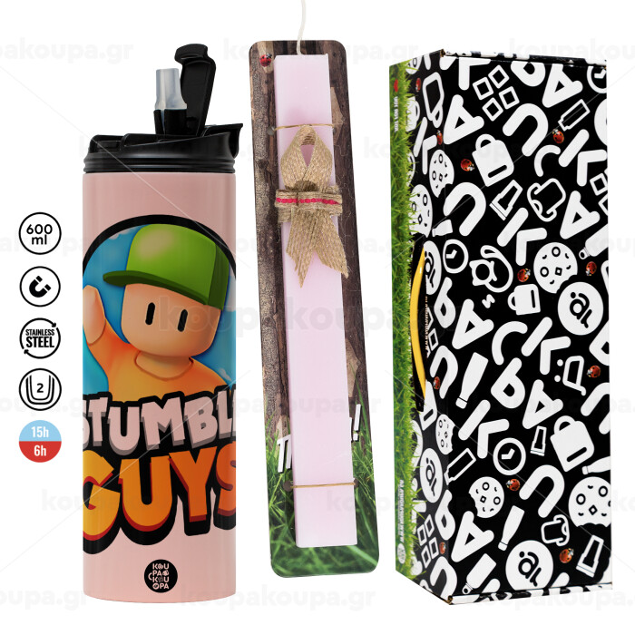 Stumble Guys, Πασχαλινή Λαμπάδα με ΡΟΖ Travel Tumbler θερμό (600ml, BPA free) & κερί αρωματικό πλακέ (30cm) (ΡΟΖ)