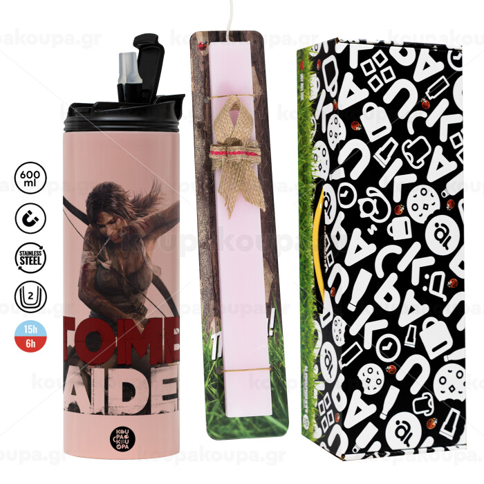 Tomb raider, Πασχαλινή Λαμπάδα με ΡΟΖ Travel Tumbler θερμό (600ml, BPA free) & κερί αρωματικό πλακέ (30cm) (ΡΟΖ)