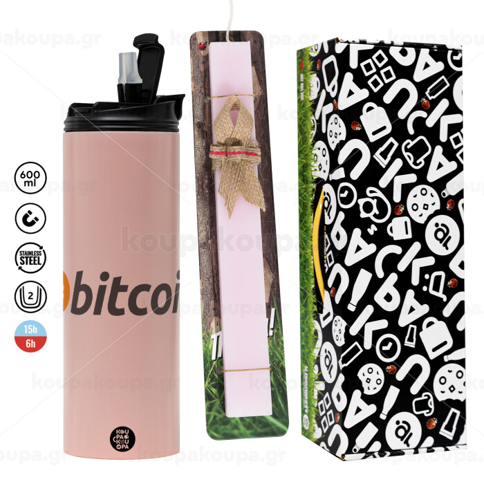 Bitcoin Crypto, Πασχαλινή Λαμπάδα με ΡΟΖ Travel Tumbler θερμό (600ml, BPA free) & κερί αρωματικό πλακέ (30cm) (ΡΟΖ)