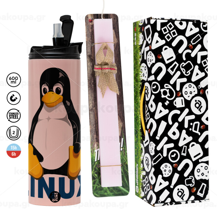Linux, Πασχαλινή Λαμπάδα με ΡΟΖ Travel Tumbler θερμό (600ml, BPA free) & κερί αρωματικό πλακέ (30cm) (ΡΟΖ)