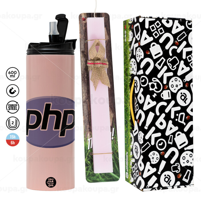 PHP, Πασχαλινή Λαμπάδα με ΡΟΖ Travel Tumbler θερμό (600ml, BPA free) & κερί αρωματικό πλακέ (30cm) (ΡΟΖ)
