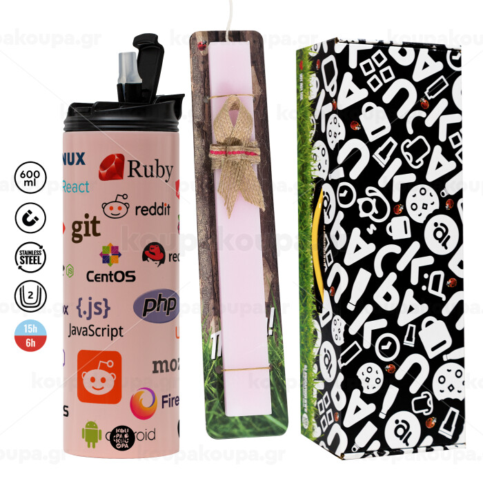 Tech logos, Πασχαλινή Λαμπάδα με ΡΟΖ Travel Tumbler θερμό (600ml, BPA free) & κερί αρωματικό πλακέ (30cm) (ΡΟΖ)