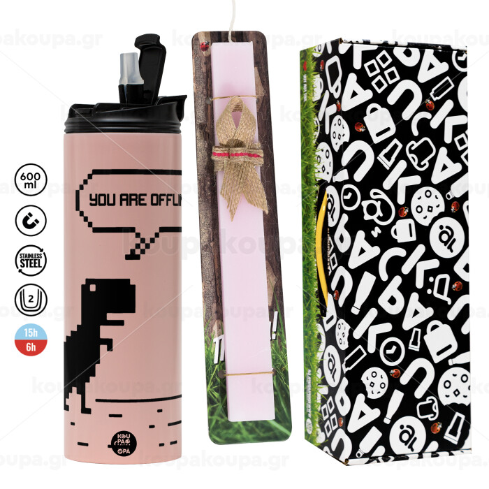 You are offline dinosaur, Πασχαλινή Λαμπάδα με ΡΟΖ Travel Tumbler θερμό (600ml, BPA free) & κερί αρωματικό πλακέ (30cm) (ΡΟΖ)