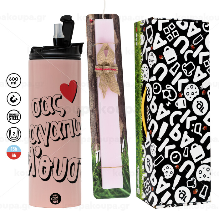 Σας αγαπώ όλ'ουστ!, Πασχαλινή Λαμπάδα με ΡΟΖ Travel Tumbler θερμό (600ml, BPA free) & κερί αρωματικό πλακέ (30cm) (ΡΟΖ)