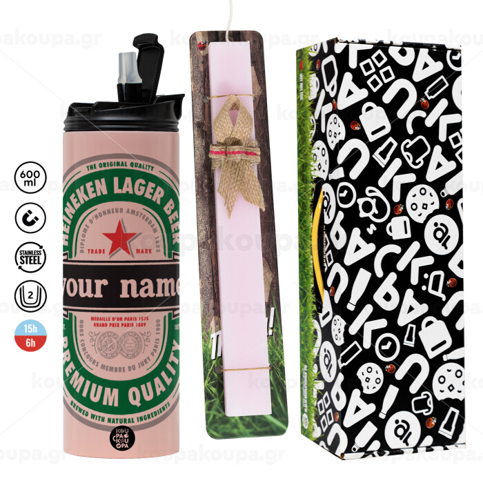 Heineken με όνομα, Πασχαλινή Λαμπάδα με ΡΟΖ Travel Tumbler θερμό (600ml, BPA free) & κερί αρωματικό πλακέ (30cm) (ΡΟΖ)