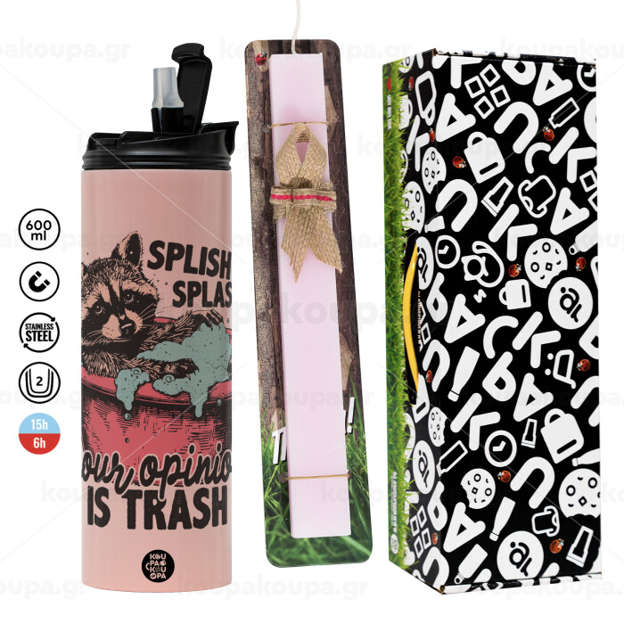 Splish splash your opinion is trash, Πασχαλινή Λαμπάδα με ΡΟΖ Travel Tumbler θερμό (600ml, BPA free) & κερί αρωματικό πλακέ (30cm) (ΡΟΖ)