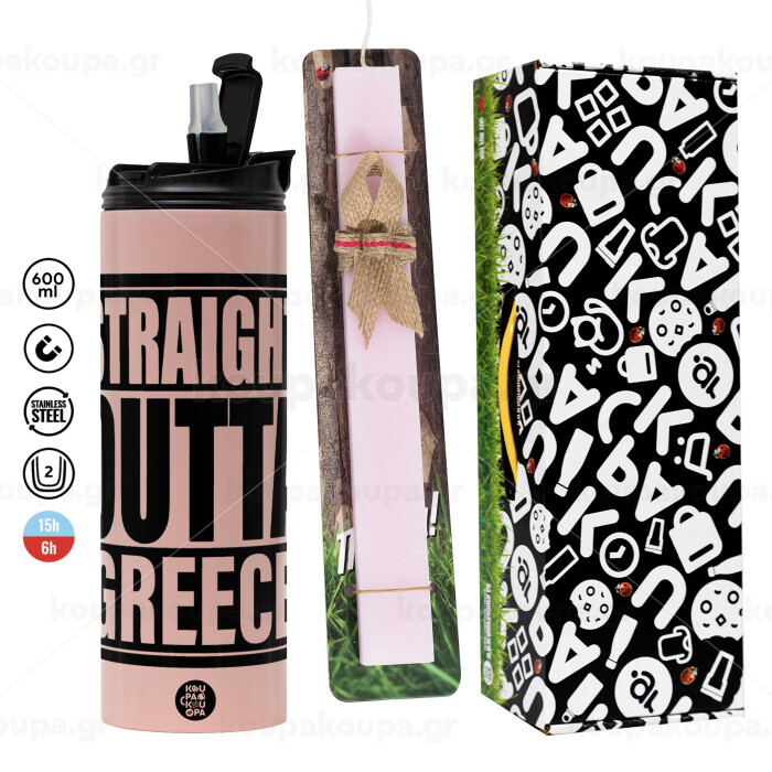 Straight Outta greece, Πασχαλινή Λαμπάδα με ΡΟΖ Travel Tumbler θερμό (600ml, BPA free) & κερί αρωματικό πλακέ (30cm) (ΡΟΖ)
