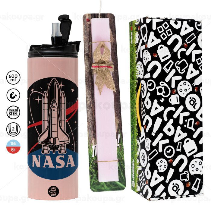 NASA Badge, Πασχαλινή Λαμπάδα με ΡΟΖ Travel Tumbler θερμό (600ml, BPA free) & κερί αρωματικό πλακέ (30cm) (ΡΟΖ)