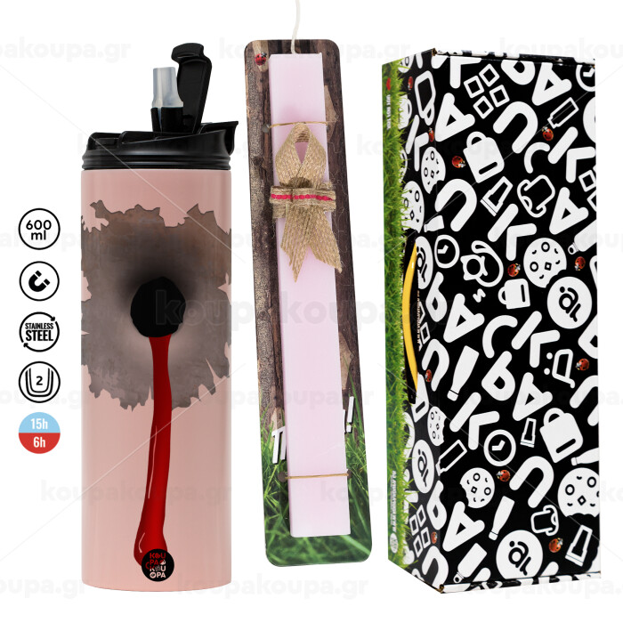 Bullet holes, Πασχαλινή Λαμπάδα με ΡΟΖ Travel Tumbler θερμό (600ml, BPA free) & κερί αρωματικό πλακέ (30cm) (ΡΟΖ)