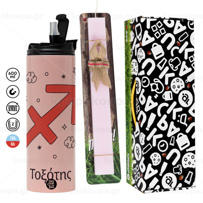 Ζώδια Τοξότης, Πασχαλινή Λαμπάδα με ΡΟΖ Travel Tumbler θερμό (600ml, BPA free) & κερί αρωματικό πλακέ (30cm) (ΡΟΖ)