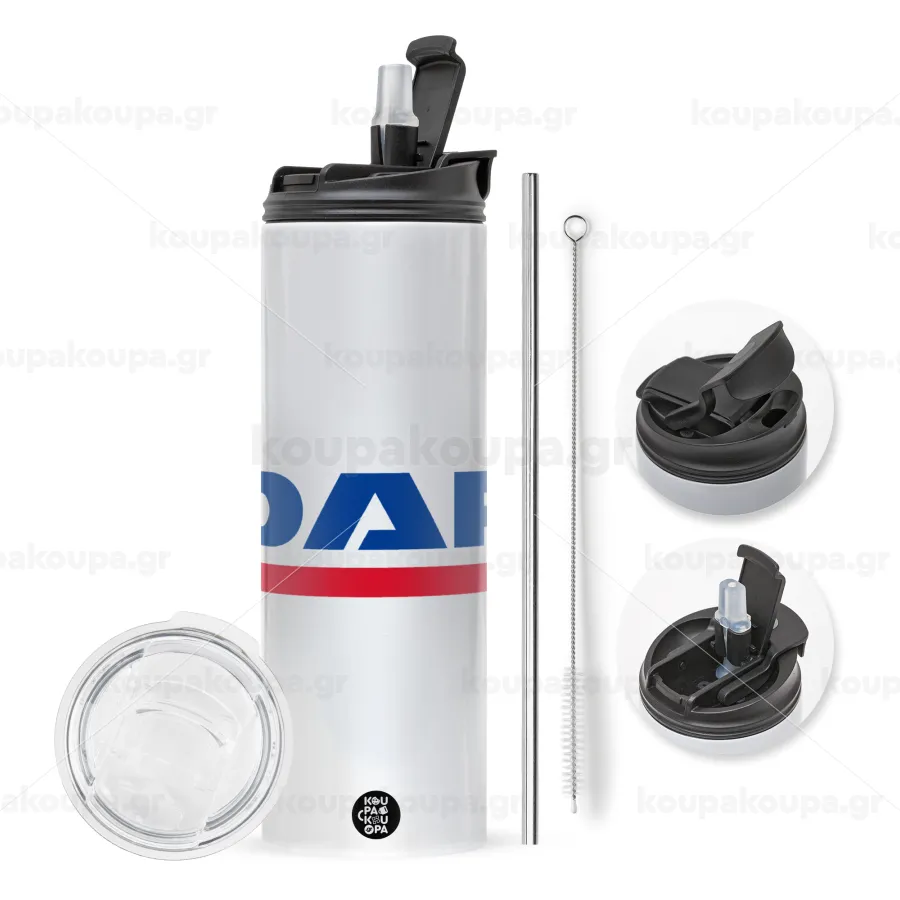 με 2 καπάκια για να επιλέξετε ανάμεσα σε απλό ποτήρι με καλαμάκι ή μετατροπή σε παγούρι θερμό με 2 τρόπους χρήσης (καλαμάκι ή στόμιο) με μεταλλικό επαναχρησιμοποιούμενο καλαμάκι. Απολαύστε το αγαπημένο σας ρόφημα κάθε στιγμή στο μοναδικό αυτό οικολογικό θερμό. Διατηρεί τη θερμοκρασία για αρκετές ώρες και είναι κατασκευασμένο από ανοξείδωτο ατσάλι. Κατάλληλο για ζεστά και κρύα ροφήματα. Συνοδεύεται από βουρτσάκι καθαρισμού για το καλαμάκι.