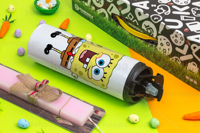 Μπομπ Σφουγγαράκης character, Πασχαλινή Λαμπάδα με Travel Tumbler θερμό με διπλό καπάκι (600ml, BPA free) & κερί αρωματικό πλακέ (30cm) (ΡΟΖ)