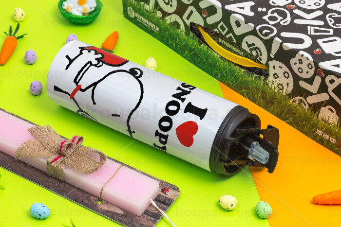 I LOVE SNOOPY, Πασχαλινή Λαμπάδα με Travel Tumbler θερμό με διπλό καπάκι (600ml, BPA free) & κερί αρωματικό πλακέ (30cm) (ΡΟΖ)