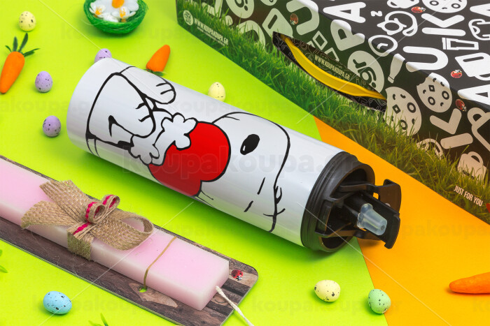 Snoopy, Πασχαλινή Λαμπάδα με Travel Tumbler θερμό με διπλό καπάκι (600ml, BPA free) & κερί αρωματικό πλακέ (30cm) (ΡΟΖ)