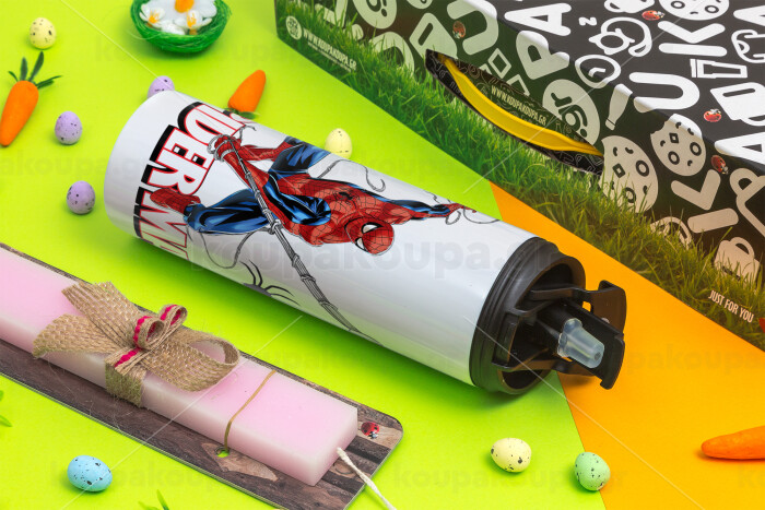 Spiderman fly, Πασχαλινή Λαμπάδα με Travel Tumbler θερμό με διπλό καπάκι (600ml, BPA free) & κερί αρωματικό πλακέ (30cm) (ΡΟΖ)